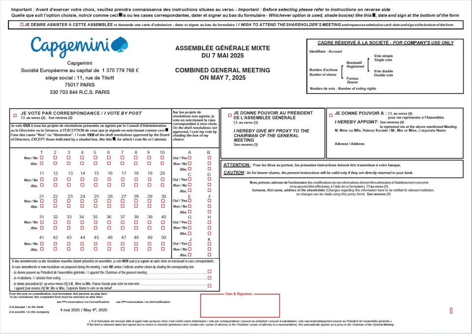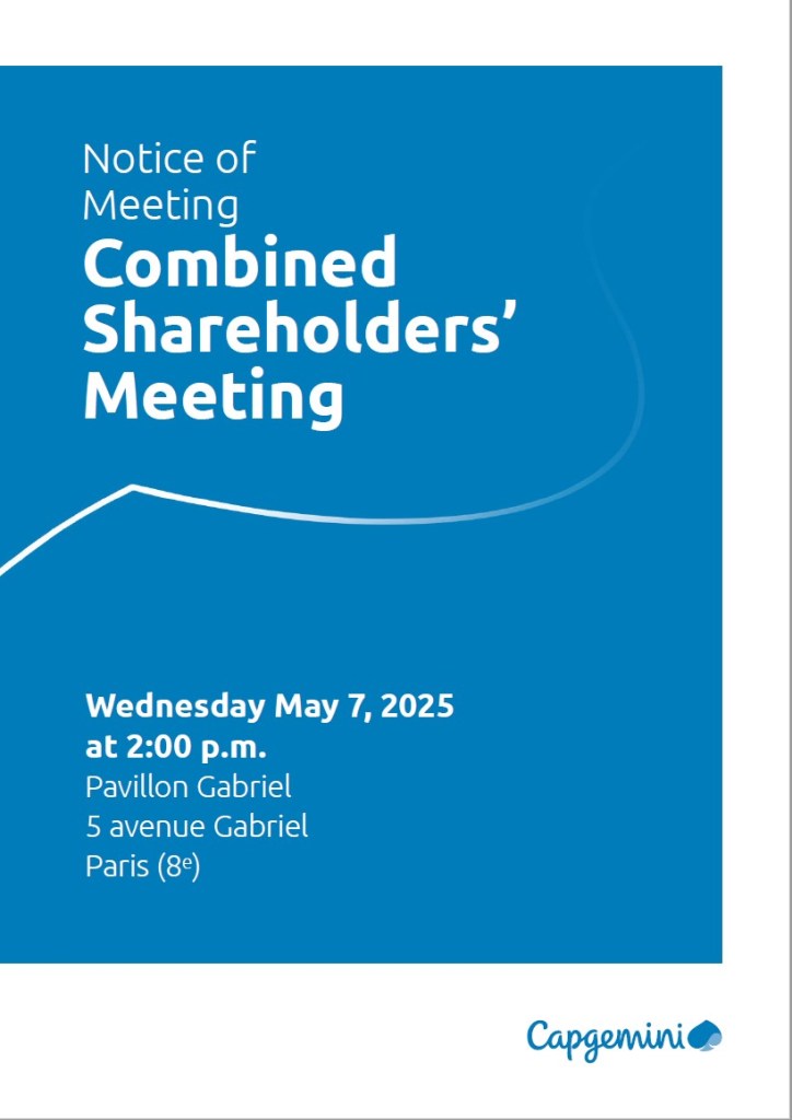 The Combined Shareholders’ Meeting of Capgemini will be held on Wednesday May 7, 2025 at 2 p.m. (Paris time) at the Pavillon Gabriel in Paris (8th District). Shareholders unable to attend are invited to watch the Shareholders’ Meeting live on the Company’s website. In addition, they will be able to ask questions live and remotely during the Shareholders’ Meeting, in addition to via the legal process for submitting written questions. Webcast of the Shareholders’ Meeting The Shareholders’ Meeting will be streamed live on Wednesday May 7, 2025 at 2 p.m. (Paris time) on this web page, with a replay subsequently available. Ask questions live and remotely during the Shareholders’ Meeting Shareholders unable to attend the Shareholders’ Meeting will be able to ask questions live and remotely during the Shareholders’ Meeting, in addition to via the legal process for submitting written questions. To do so, shareholders must login in advance to the VOTACCESS platform and confirm their wish to ask a question remotely.